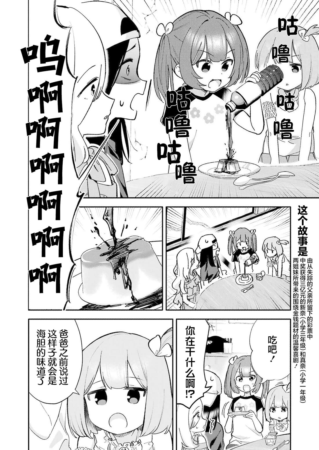 两个月前,父亲留下一封写著「人生就是冒险!!」的字条,便神秘消失了,只留下小学生姐妹新奈和真奈一直在家中等候归来。然而某一天,父亲作为生日礼物留下的彩票,竟然出了3亿日元大奖……。还只是小学生的新奈和真奈,并不明白这笔巨款的价值。为了「尽享奢华」,她们走进了一家神秘的店铺……